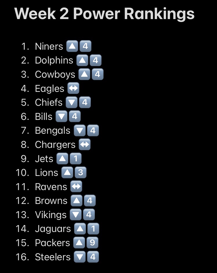 The transition from Week 1 to Week 2 is pretty drastic all around as now we’ve got to see a little bit of what teams are made of and some of my preconceived notions get tossed out the window. There’s usually some discourse around these movements, but I like to see that. Just keep in mind that even if your team won, they may have slid in the rankings if other teams ranked lower than them won in a more convincing fashion. Let’s check it out: