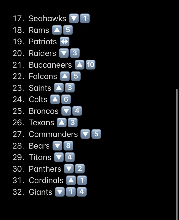 The Rams leap up 5 spots as they won convincingly against Seattle. I don’t expect them to beat the Niners, of course. If it’s close, that’ll be good enough.