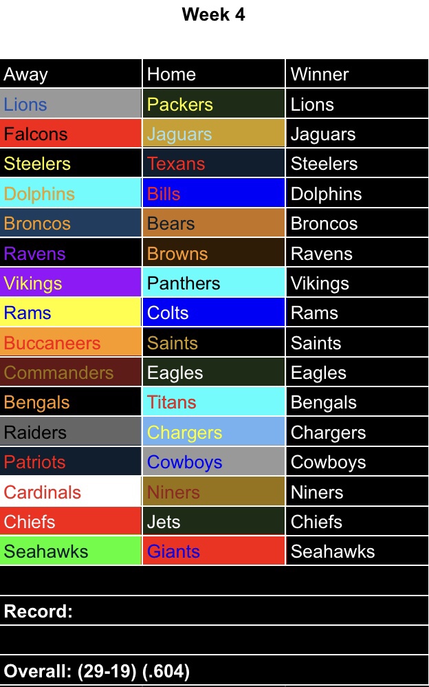 Rams @ Colts – At the start of the season, this game wouldn’t have registered on my radar. But here we are in Week 4 and both of these teams are showing signs of life. I feel that the Rams are a little more consistent and have a little more talent, so I’ll give them a slight edge.