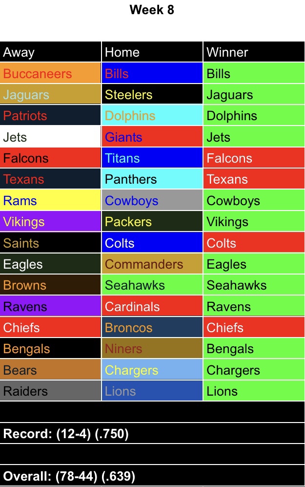 Heck of a turn around if you ask me. But if history tells us anything, I’m doomed to fail in Week 9. Wonder how I did in bets?