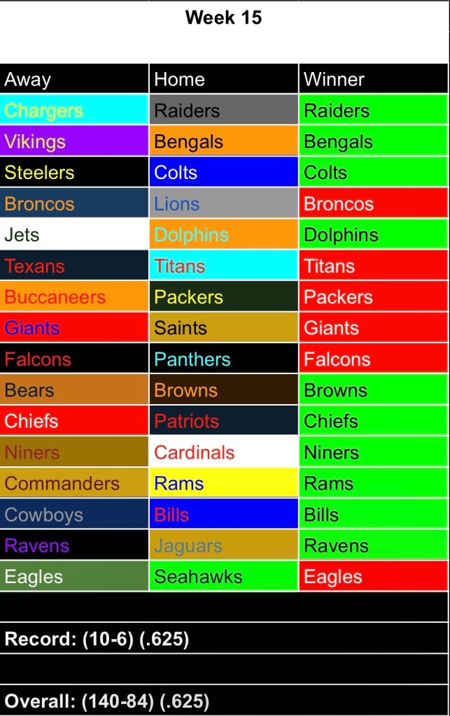 On Christmas Day, the Raiders kick things off against the Chiefs. The Chiefs have had their fair share of struggles this year, but they tend to dominate their AFC West rivals. I think Vegas will make this a good game, but ultimately, they’ll fall short. I would like to point out, though, that should Vegas win here, and win out the rest of the season, along with KC losing out, they could actually win the AFC West. Seems pretty unlikely, but there is a chance.