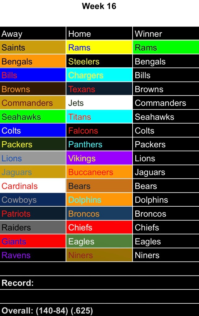 I’ll take 10-6 any day. Broncos over Lions was a pretty bad call on my part, I’ll admit. Giants over Saints was wishful thinking. The other misses were slight surprises with the exception of the Seahawks win, which was a big surprise.