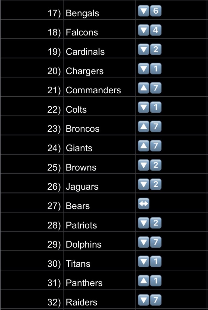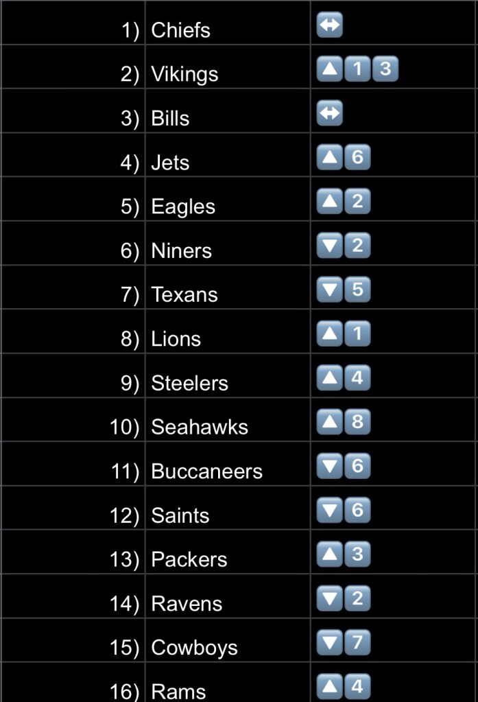 - Chiefs – You oughta know by now. They stay until they lose. KC gets a banged up Chargers team this weekend, so I think their spot is safe.