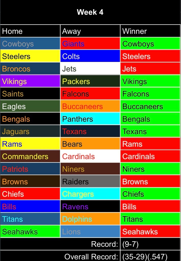 Week 4 was…better than the last two weeks, but still not my best stuff. I’ll take 9-7 over 7-9 any day though. Gotta string together a few good weeks together to get back on track. Let’s see the damage: