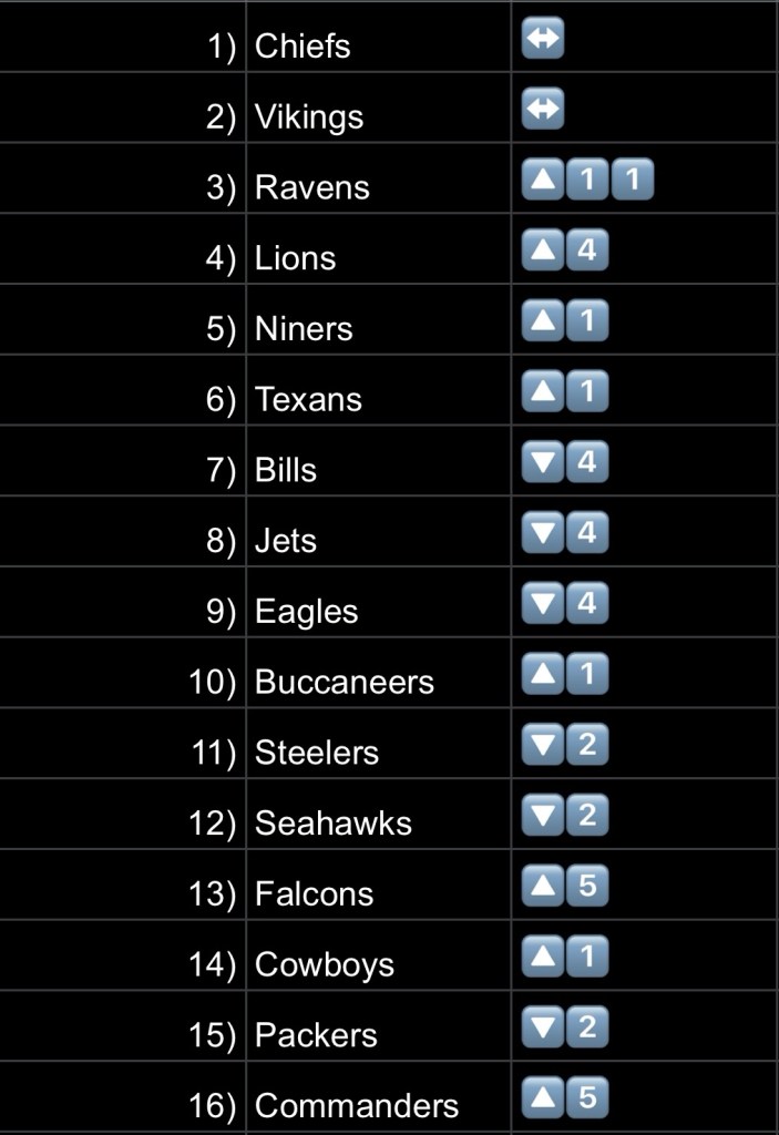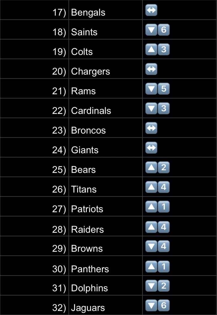 16. Commanders – Another team that jumped up 5 spots. That offense is looking crisp. The Browns defense should provide a better challenge than Arizona or Cincinnati have the last few weeks.