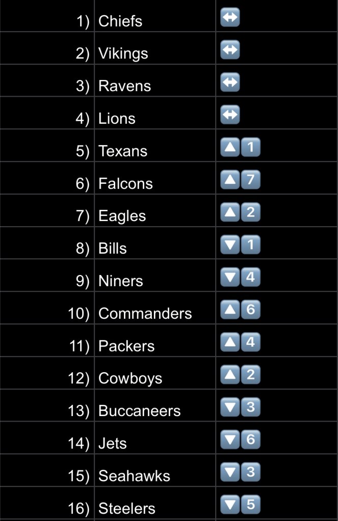 - Commanders – Welcome to the Top 10, Commies! They just keep cooking. A very tough matchup against the Ravens this week could mean a short lived initial berth in the Top 10, but for now, they certainly deserve to be here.