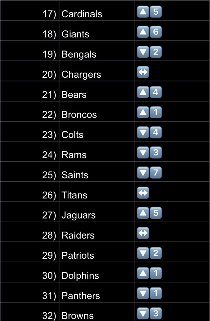17. Cardinals – This team is just hard to call, but you gotta appreciate the win over SF. They can either beat the Packers by 2 or lose by 20, it’s really a matter of chance.