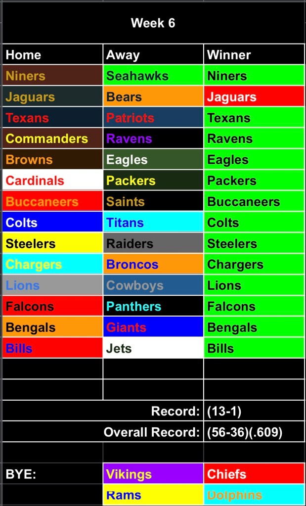 Once I took in the full scope of what had transpired on Sunday by the end of the late slate, I realized I had made an egregious error. Only one loss through 12 games, hey, that’s pretty good. But really, it was too good, or maybe it just wasn’t good enough. I can handle a .500 day, a .750 is always nice, but I quickly realized I was in a precarious position. If I drop another game or two, it’s not great but I can manage. But if I win out (and boy did I), I’ll have to live with the one miss being because I picked the Jaguars to win a football game in 2024. Unbelievable, but let me walk you through my logic here: I knew that the Jags/Bears affair in London could get kinda weird. I knew that the Jags had a lot of experience playing across the pond. Jacksonville really needed to get some momentum going after picking up their first win in Week 5. After all, this team was supposed to be competing for the AFC South title. Yeah, they got off to a slow start, and the Bills game was embarrassing, but the rest of their games were close. The other 3 losses were by a combined total of 12. This is a decent team, they just had some bad breaks. But now look at ‘em. Just beat the Colts, they know London like the back of their hand, I think I gotta roll with them…