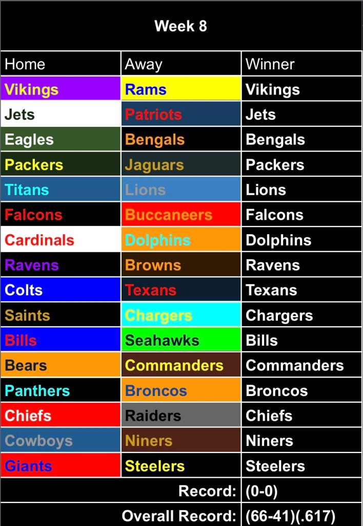 I’m not sure why, but the schedule this week feels very busy. Maybe it’s the absence of any byes, maybe it’s the imminent return of several star players, or maybe even the lingering questions about the status of players who got injured last week (looking at you, Jayden Daniels). I found several of these games challenging to pick this week. On one hand, that’s a plus because it means there’s some great matchups. On the other, it usually doesn’t bode well for my record. Oh well: