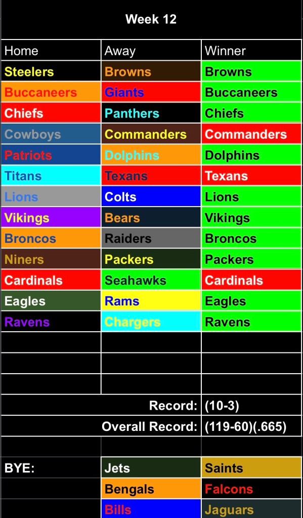 Week 13 Picks tomorrow..or at least the Thanksgiving games and the Black Friday game. We’ll see ya then.