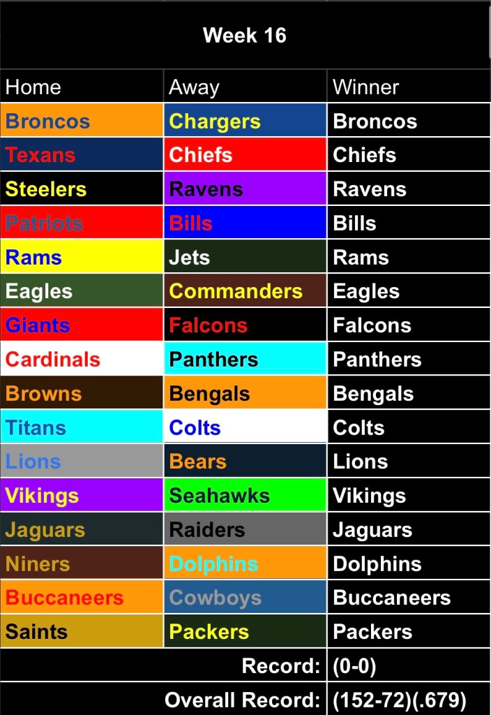 Eagles @ Commanders – Finally, a little NFC action. While a Commanders win would do little in terms of the NFC East race (Philly finishes against Dallas and NYG), it would strengthen Washington’s hold on a Wildcard spot and hurt the Eagles’ chance at the 1 seed. The Commies finish the season against a reeling Atlanta team that is giving first round pick Michael Penix Jr. his first start this week and Dallas (who they did lose to in a surprising Week 13 result). That’s a decent couple games to end on when you’ve got Seattle/LA Rams sitting just one game back. Now, those two teams do play each other still so one will have a guaranteed loss (please no ties). But who knows, Penix is still an unknown until we see him in action this week, and he could be the jump that Atlanta needs to get going. Win now, you feel a little less pressure in the final two weeks. As for Philly, like I said, their last two are cakewalks so if they take care of business, they’ll need to see the Lions drop a game (most likely Minnesota in Week 18) as well as have Minnesota lose a game to either the Seahawks this week or Green Bay in Week 17. There’s probably a couple ways it could shake out but if both of those teams win their next two, it will not be possible for Philly to get the one seed (barring a tie between Detroit and Minnesota in Week 18, please do not let this happen I beg). Exciting stuff. I like Philly because they’re clearly the better team, but I’m aware that the better team doesn’t always win. Should be a good one.