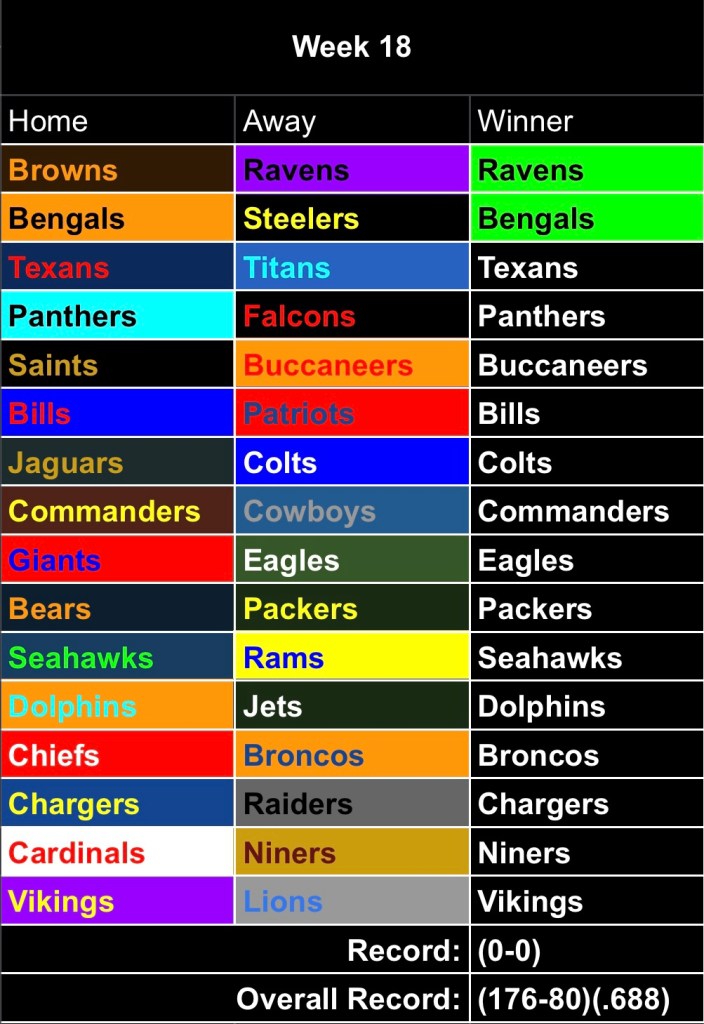 AFC Wild Card – The Bengals upheld their end of the deal yesterday with a win over Pittsburgh. They need a Dolphins loss/tie + a Broncos loss to get in. Miami gets in with a win + Denver loss. Denver is win and in.
