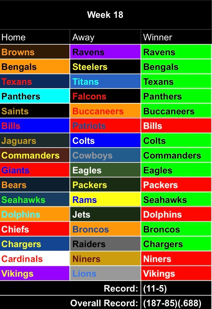 Well, the end of season power rankings will be out tomorrow (maybe). So yeah, you don’t wanna miss that. It’s exhilarating stuff. Wild Card picks will be out Friday maybe. Maybe Saturday morning? Couldn’t tell ya.