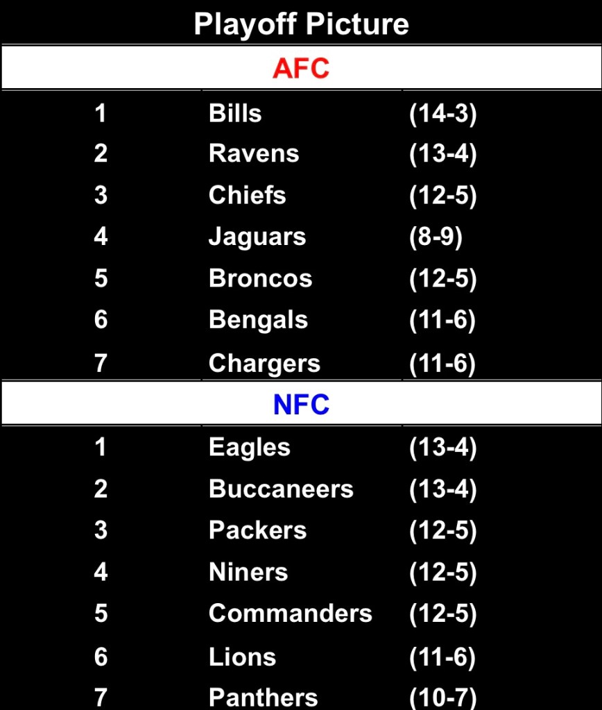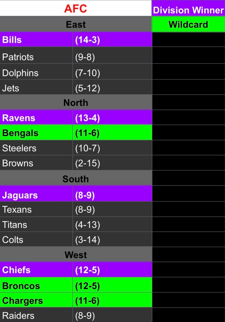 Ravens @ Bills – I don’t really have to say anything here, right? It’s the two Super Bowl favorites, it’s Lamar Jackson and Josh Allen, it’s gonna be a real doozy.