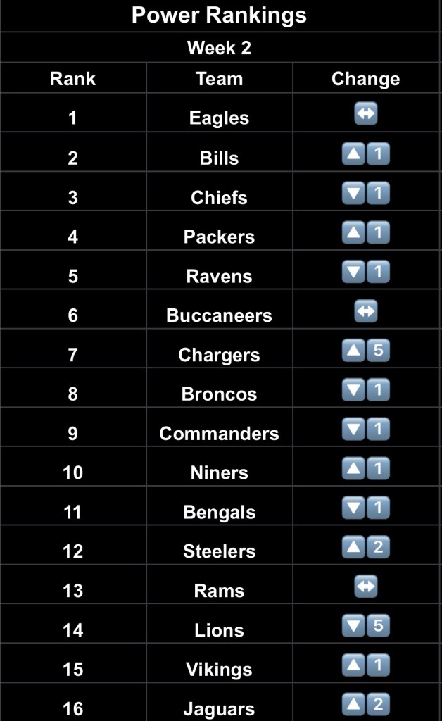 - Eagles – The defending champs hold onto the top spot with their opening night win against Dallas. Up next: Super Bowl rematch in KC.