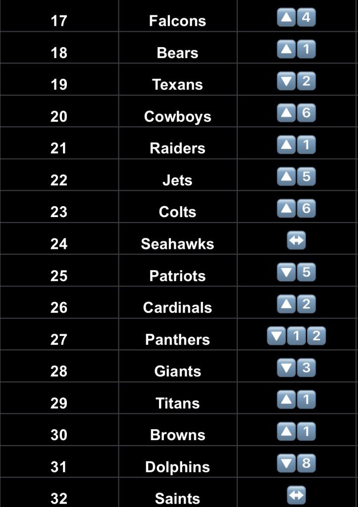 - Niners – I actually don’t know why the Niners are here. They’re already banged up, probably should be a few slots down, but here they are. And they might even be able to stay here considering they play the Saints this week…