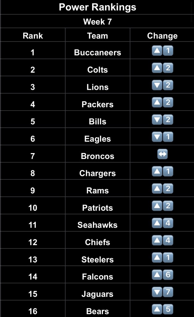 - Buccaneers – Despite not having Mike Evans, Chris Godwin, or Bucky Irving, Baker Mayfield and the Bucs continue to get it done. Gritty team. Up next: Monday Night against an equally gritty Lions team.