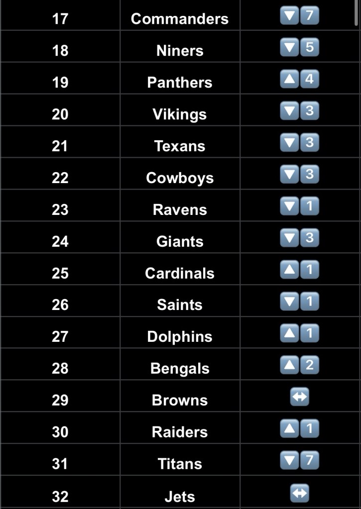 - Packers – I think I’ve got the Packers way too high here given that their last three games were: Loss to the Browns (lol), tie against Dallas (lol), and barely scraping by against the Bengals led by Joe Flacco who had only been in town for a couple of days (lol). Something is not quite right with this team. Up next: The cheese boys head to the desert for a date with the Cardinals.