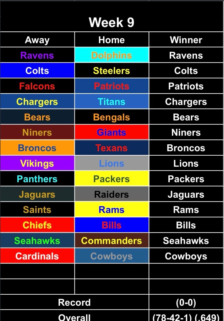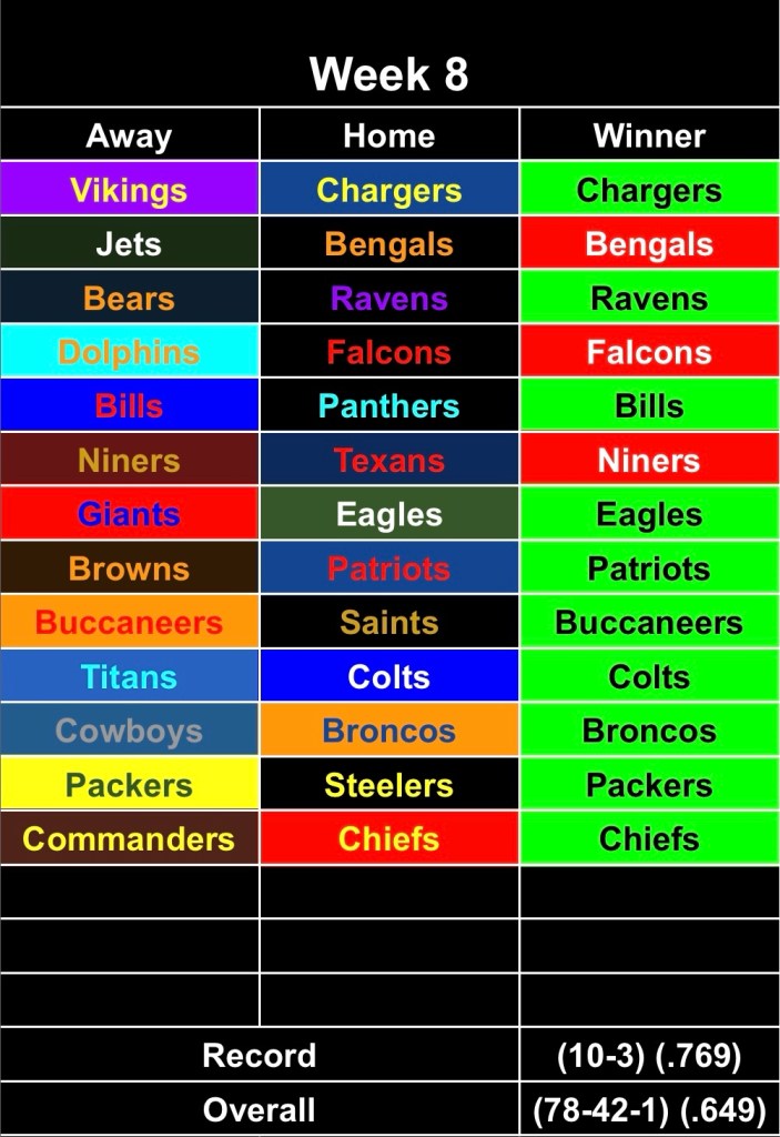 Week 8 was pretty solid…hard to predict the Jets and Dolphins both winning on the same day. Niners/Texans felt like a coin flip so I’m cool with that.
